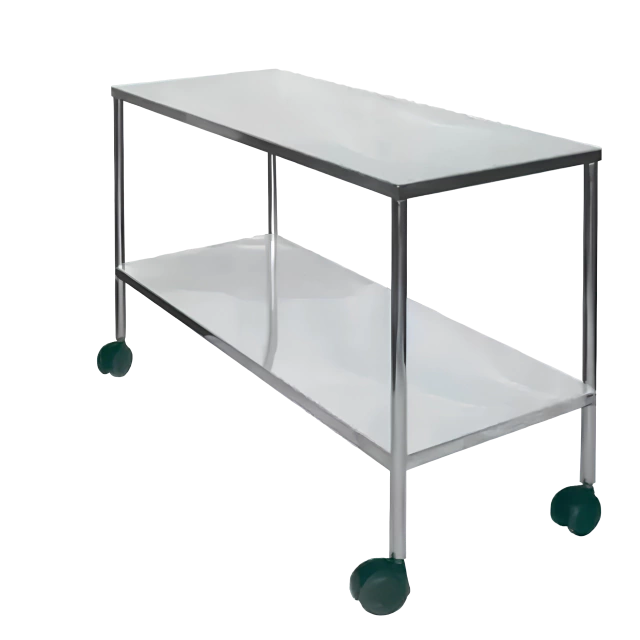 Esta mesa auxiliar em aço inox é uma escolha ideal para ambientes médicos devido à sua resistência e facilidade de limpeza. As opções de mesa com ou sem rodízios oferecem flexibilidade de uso, e a possibilidade de adicionar uma varanda aumenta sua utilidade ao proporcionar mais espaço de armazenamento. Seu tamanho generoso a torna adequada para uma variedade de procedimentos médicos e acomodação de equipamentos.