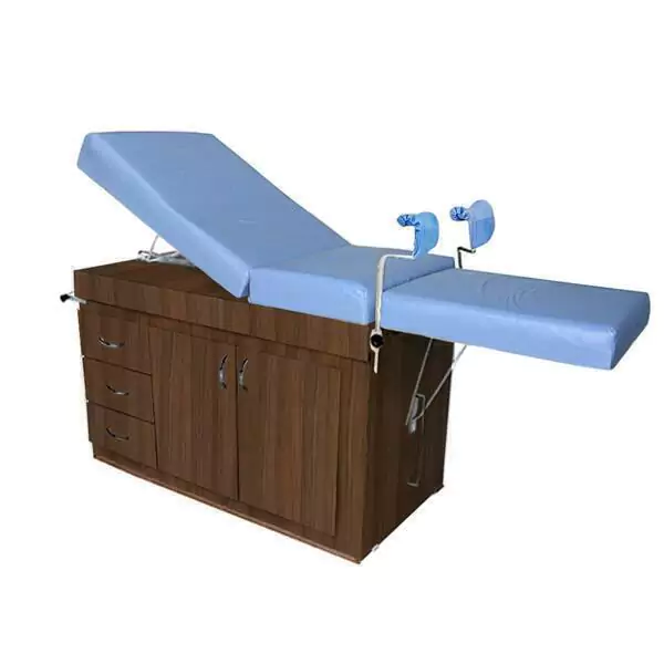 Armário com Portas, Prateleiras Internas e Gavetas: Esta mesa ginecológica possui um armário integrado que oferece espaço de armazenamento adicional com portas, prateleiras internas e gavetas para organizar equipamentos médicos e suprimentos.